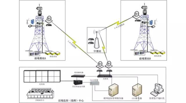 森林防火综合能力监控系统由指挥中心系统、无线传输系统、红外热成像、摄像机和镜头系统、云台控制系统、电源系统和铁塔组成。