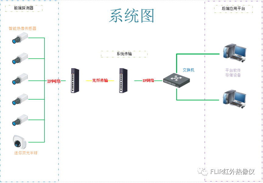 前端探测器部分由五台智能热线传感器和一台迷你双光半球组成,通过IP网络形式接入到系统传输部分。