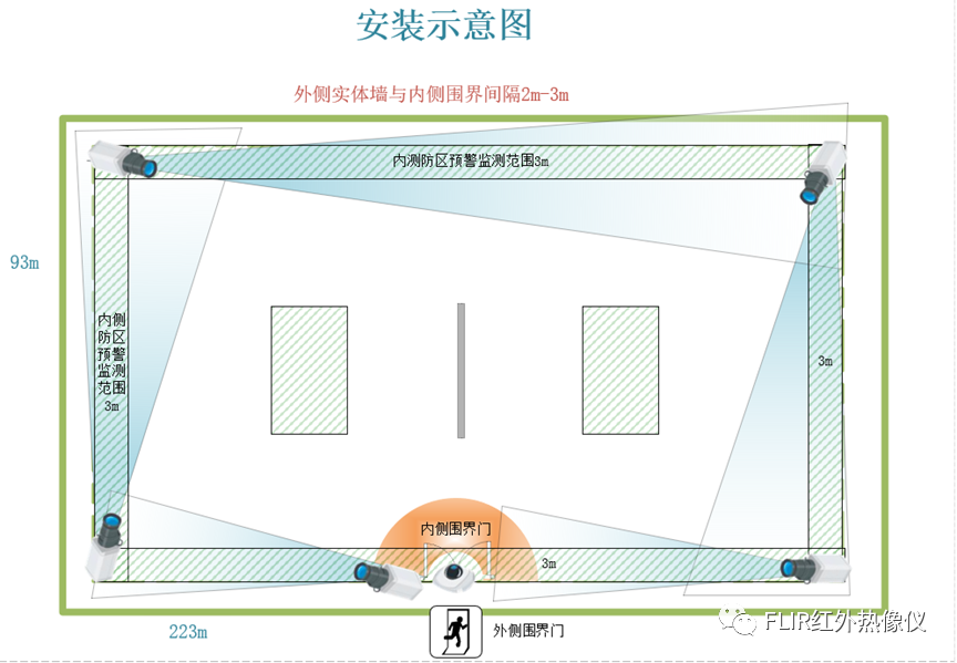 整个系统采用了尾追尾的安装方式,实现了全方位无死角的检测。在内侧防区采用壁装的方式从内侧围界门左侧开始安装,尾追尾的形式绕内侧围界一圈共需要五台智能热线传感器,检测的预警区域在靠内侧防区3m左右。